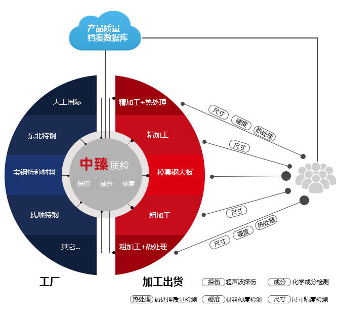 品質管控體系總結概括是“一證,三重,五檢,大數據”,它是山東中臻18年經驗的結晶。所謂“一證”是指中臻每一種牌號的每一批貨都會要求廠家提供品質保證書;“三重”是指中臻從進貨到加工到出貨,會進行三重品質檢測,保證最優品質的材料送達用戶手中;“五檢”是指品質檢測中五項內容,分別是超聲波探傷檢測,化學成分檢測,預硬料硬度檢測,熱處理質量檢測和尺寸精度檢測;“大數據”是中臻的產品質量檔案數據庫,它集合了原材料從工廠到中臻再到用戶全過程中的品質反饋信息,并通過大數據系統整合分析,再反饋生產線改善,并不斷的循環改善。